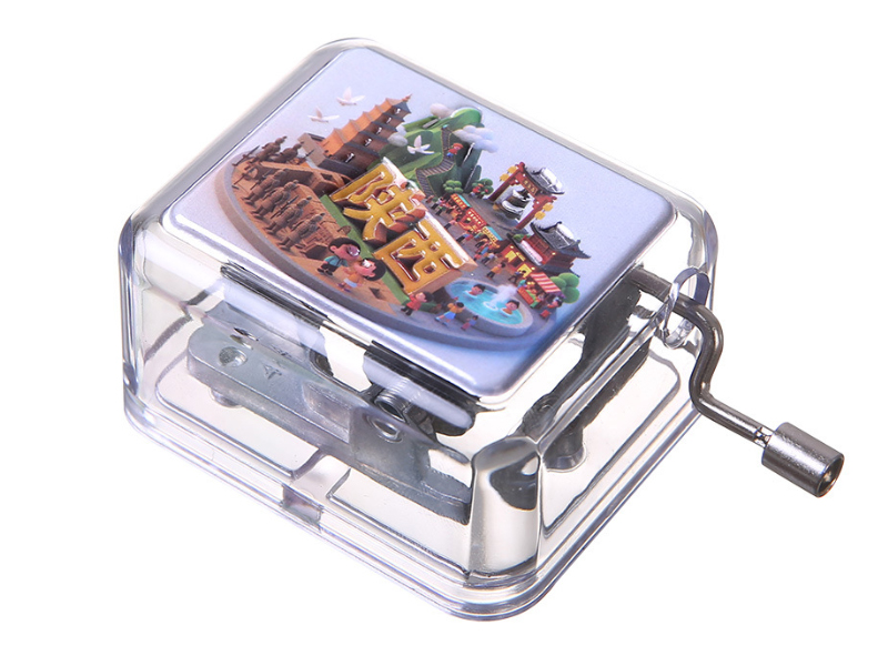 Featuring a square casing made of high-transparency acrylic (transparent plastic), the internal metal mechanism is fully visible. It includes a metal hand crank on the right side, requires no batteries, has a purely mechanical structure, and is durable and easy to operate. A custom label can be added to the top of the lid.