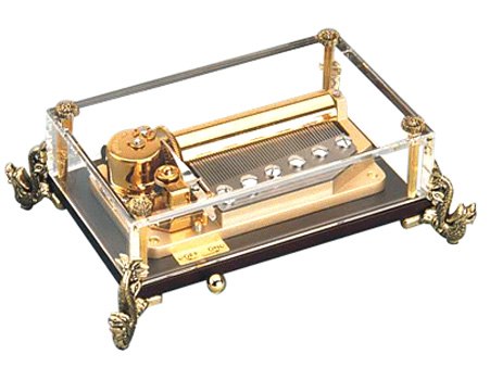 Das Spielwerk ist in der durchsichtigen Box sichtbar. Das Spielwerk mit Handkurbel und das Spielwerk zum Aufziehen sind optional.