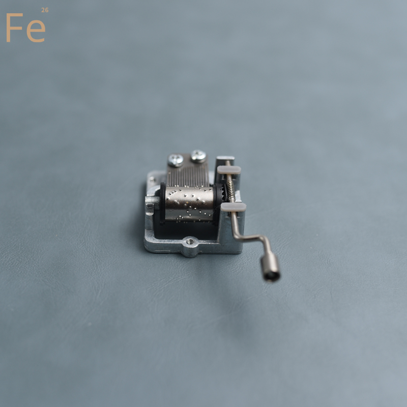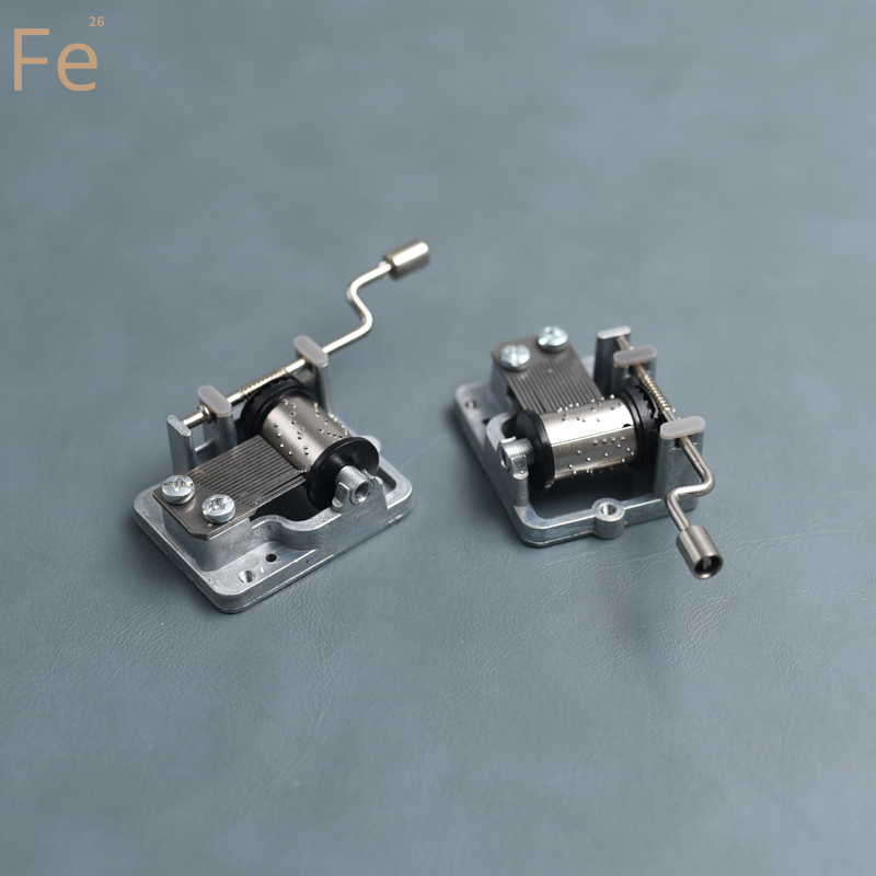 - Mecanismo de caja de música con mango de metal plateado y manivela.