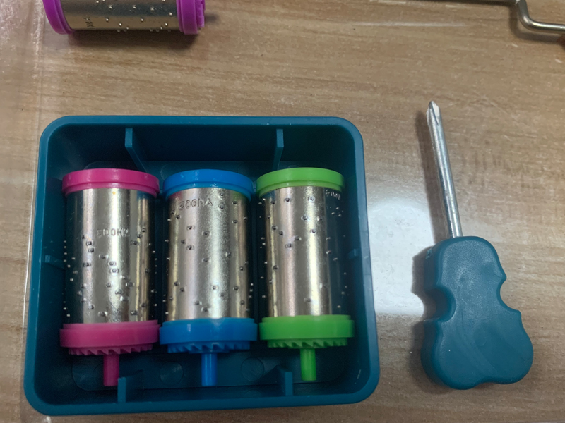 4. Placez le peigne sur la base et ajustez la position du peigne. Jusqu'à ce que la première broche et la dernière broche du peigne soient adjacentes aux deux extrémités du corps du tambour, comme un, b. Fixez ensuite le peigne avec 2 vis.