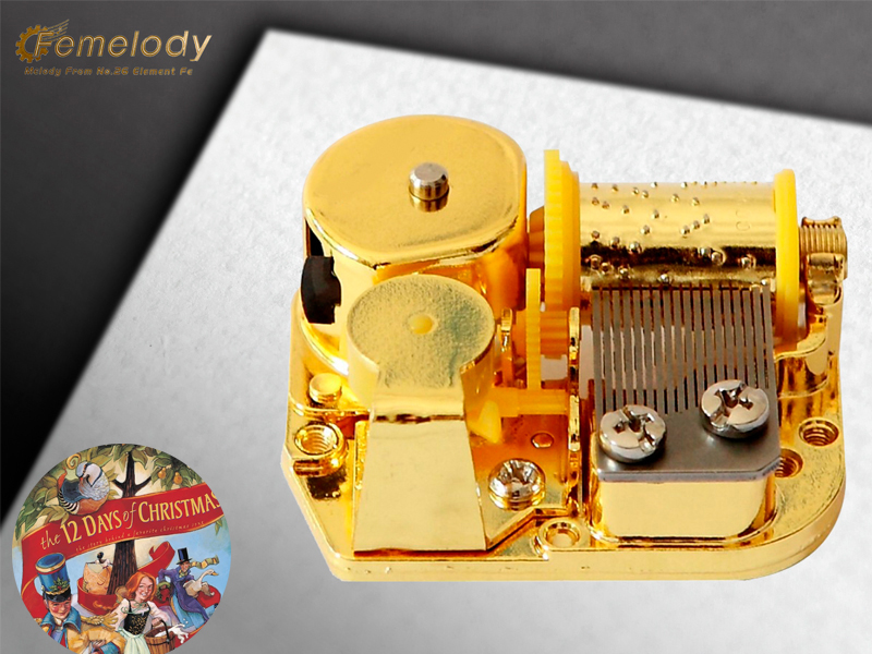 Brand Name: Femelody Category: Christmas Tunes Model Number: FETTDOC18 Available Melody: The Twelve Days of Christmas Material: Zinc-alloy Customized Music: Available Application: 18 note music movement Price: $1~399/pcs Unit Size: 50.5*44.5*27mm Feature: Wind up Unit Weight: 50g Lead Time: 3 weeks after we received the payment Play Power: Mainspring Sample Order: Available Packaging: 25pcs/base,400pcs/carton Place of Origin: Ningbo,China MOQ: 400pcs/tune Departure Port: Ningbo,Shanghai Music Duration: One tune of about 13~20 seconds,3 minutes power reserve Payment: T/T 100% payment in advance,Paypal