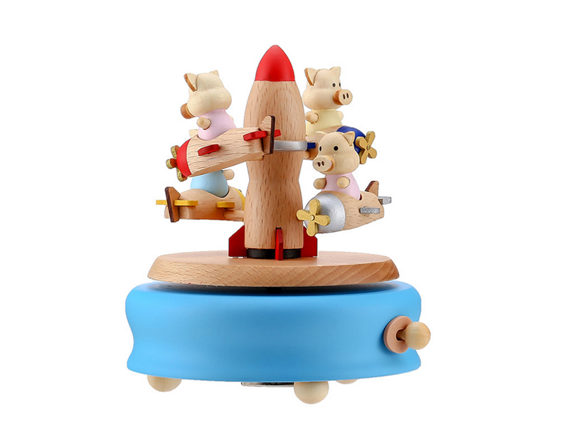 blue wooden music box base, four cute little pigs are riding a small plane and rotating with the music.