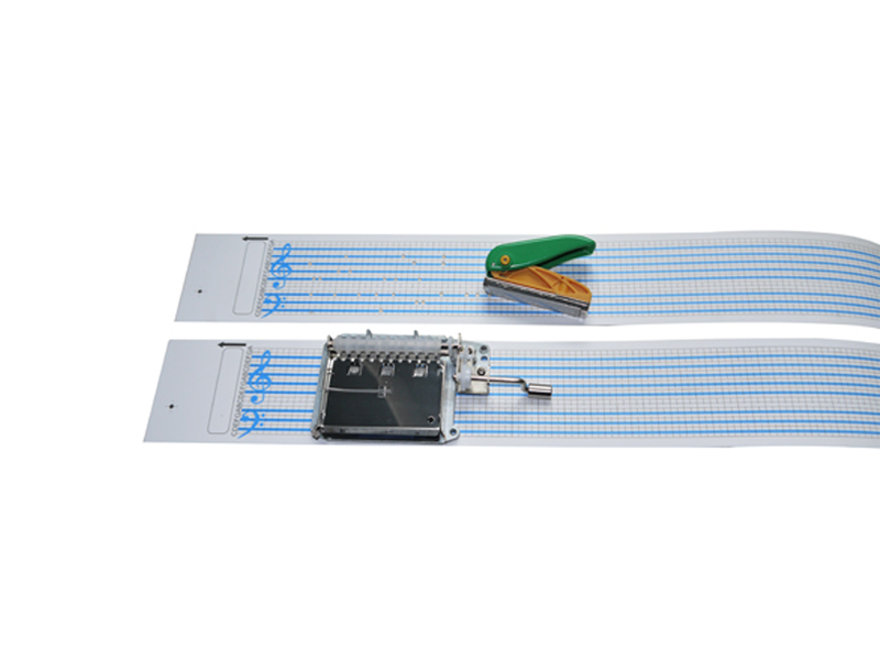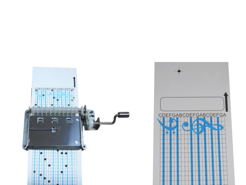 Questo movimento musicale di 20 note a manovella funziona tramite strisce di carta perforate.